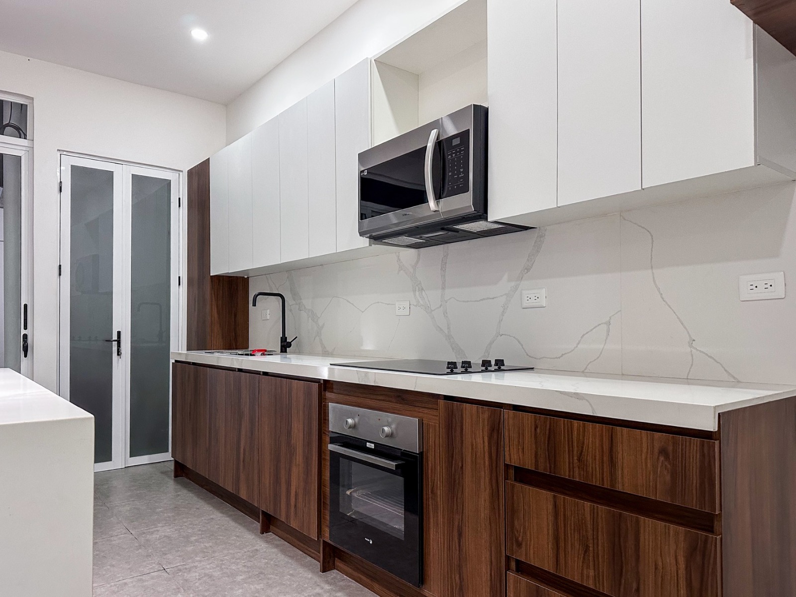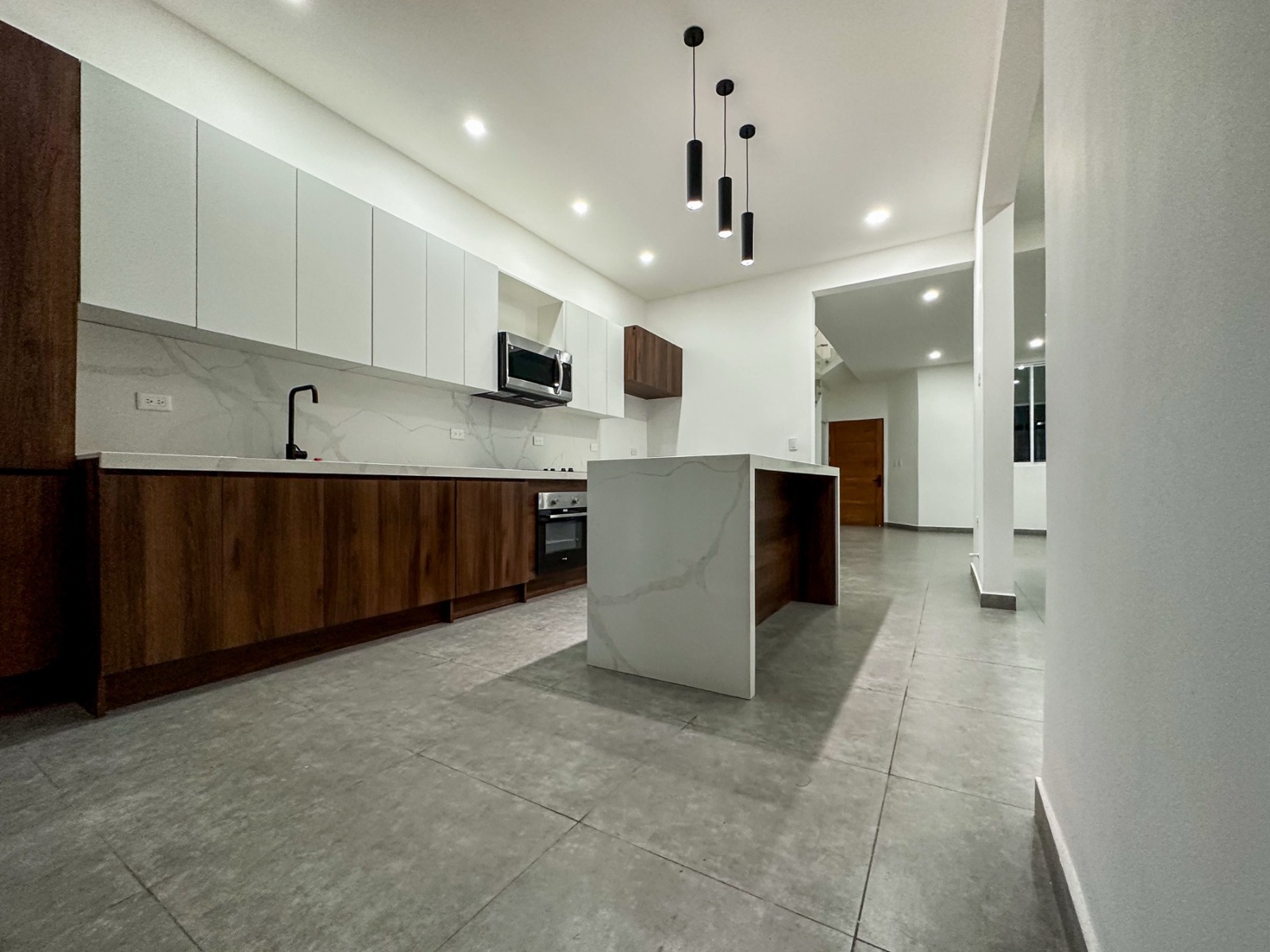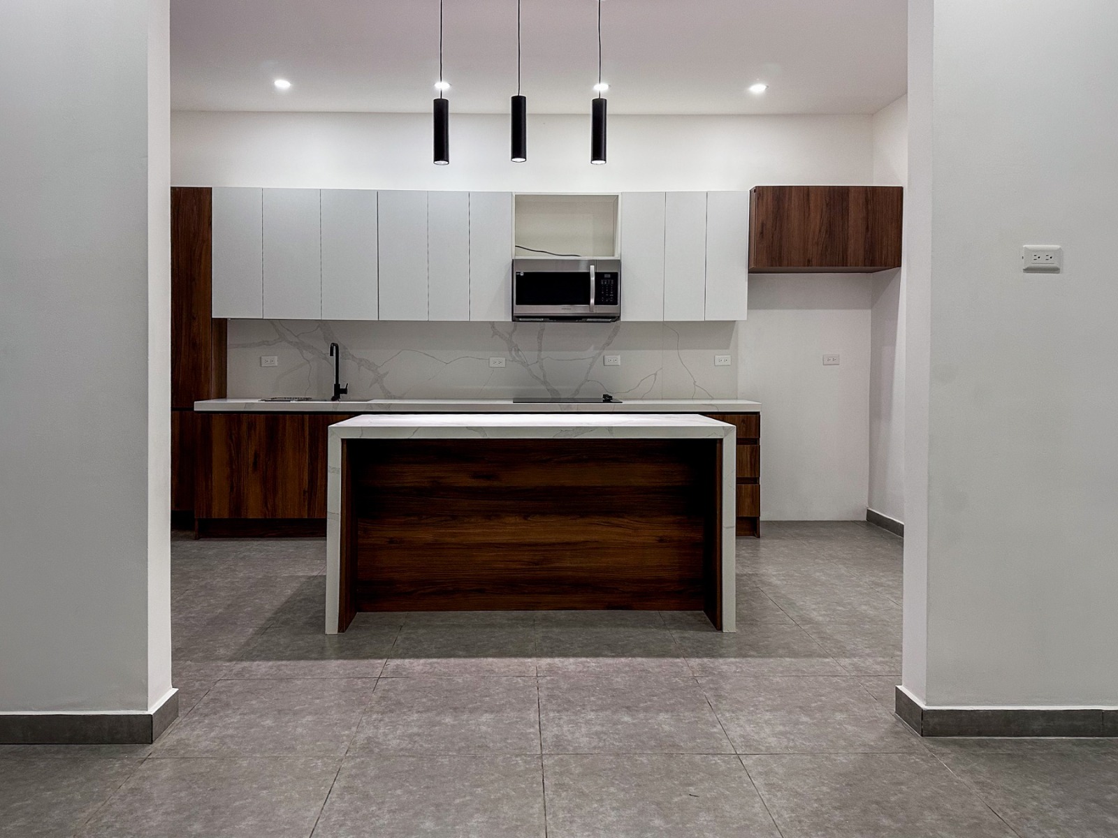 - Isla central con cascada de cuarzo tipo Calacatta