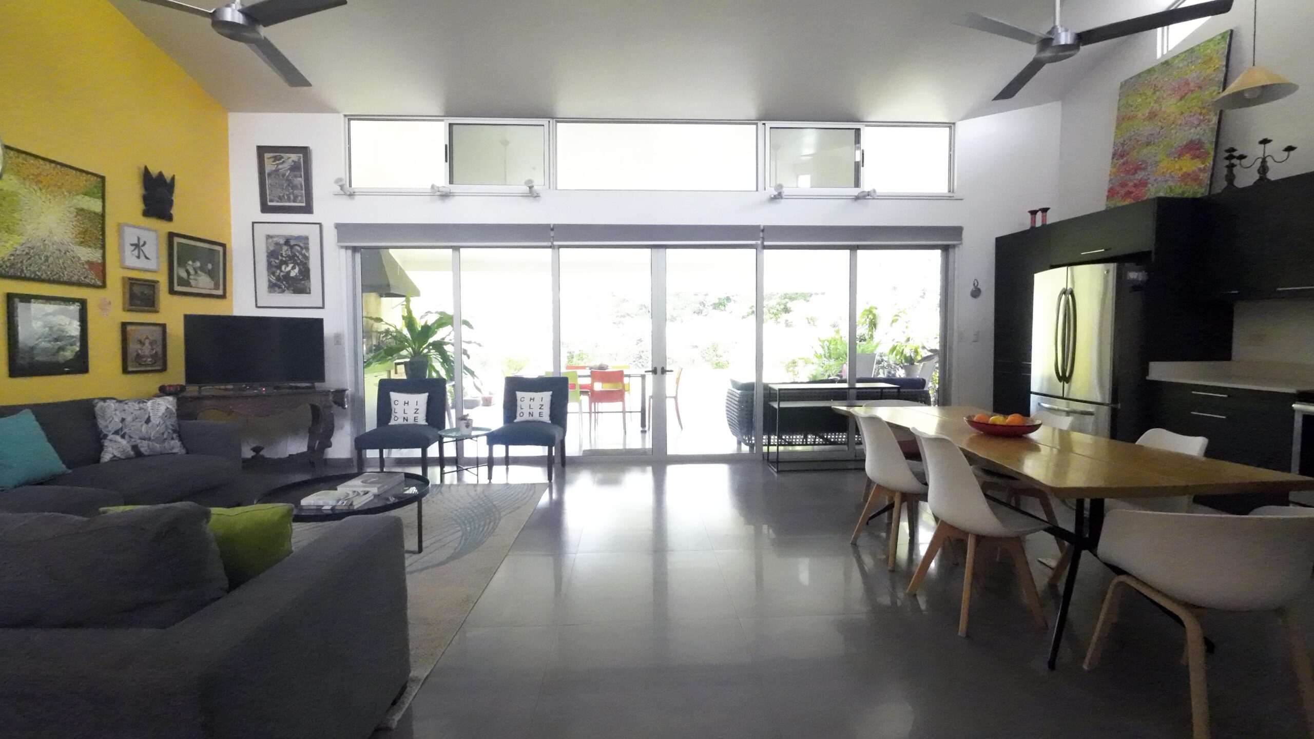 Cocina moderna con sobres de cuarzo, integrada a sala y comedor